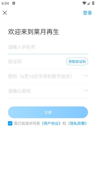 用户可在登录界面选择注册新用户,输入手机号、验证码和密码进行注册,简单快速。
