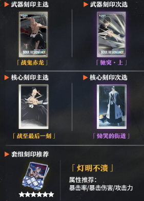 黑崎一护:核心输出角色,普攻积能快,必杀技兼具群体清场和单体爆发能力,是推图与PVP的不二之选。建议优先升级技能等级,搭配暴击率提升的刻印,最大化收割能力。