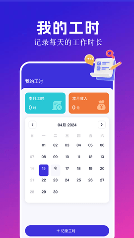 注册完成后,进入主界面,选择记录工时功能,输入当日的工作开始和结束时间,系统会自动计算工作时长。