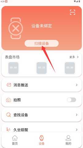 首先确保手机的蓝牙功能已开启,在软件的设备管理界面点击扫描设备,找到您的智能穿戴设备并进行绑定即可。