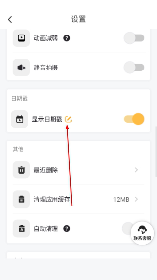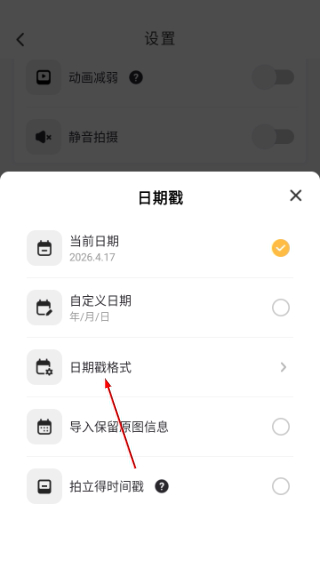 2、找到显示日期戳选项,点击进入日期戳设置界面。