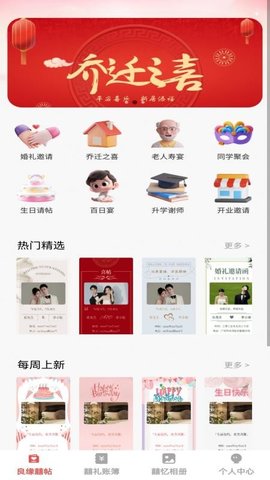 良缘知囍是一款专注于喜帖设计和酒席账单管理的综合软件,为用户提供便捷的庆典筹备体验。软件结合了高效的设计功能与全面的记账系统,帮助用户轻松制作出精美的邀请函,并高效管理庆典相关的账务。从丰富的模板库中选择适合的设计,满足各种庆典的需求,如婚礼、寿宴、生日等。每周更新的模板和热门设计推荐,确保用户总能找到灵感,轻松搞定庆典筹备。