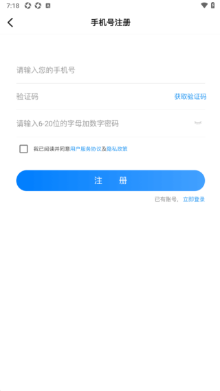 3、如果你是新用户,需要先进行注册。在注册页面,输入你的手机号码、验证码和设置密码,然后点击“注册”按钮即可完成注册。
