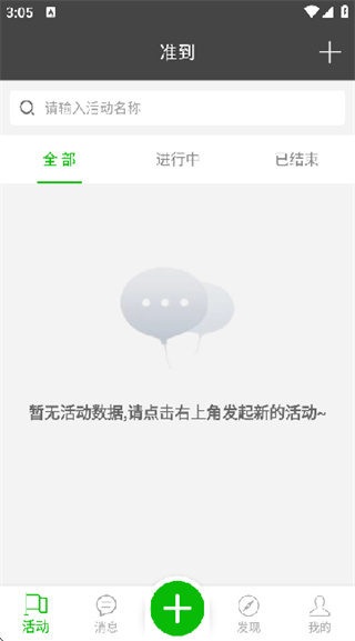 2、进入首页后,您可以点击“+”快速发起新的活动,也可以查看正在进行和已结束的活动。