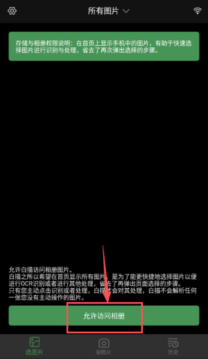 2、进入权限申请页面,点击“允许访问相册”,为应用授予读取手机照片的权限。