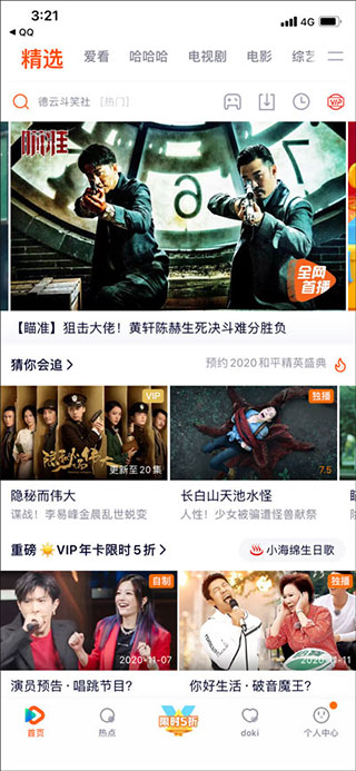 2、然后会看到首页、热点、会员、diki、个人中心五个板块,其中在首页中包含了精选、爱看、哈哈哈、电视剧、动漫、电影、综艺频道等诸多频道;