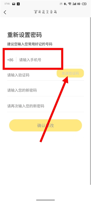 在密码重置页面,输入注册时使用的手机号码,点击【发送验证码】按钮获取验证信息。