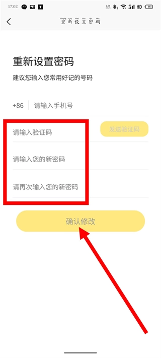 输入收到的验证码并设置新密码后,点击【确认修改】按钮,即可完成密码重置操作。