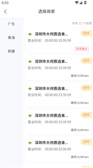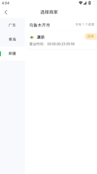 3、这里需要用户选择商家进行使用。目前提供广东、青海、新疆等地区的选择。