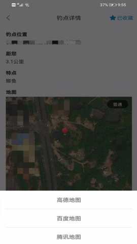 多种地图选择,在钓点详情中可以选择高德、百度或腾讯地图,方便导航到达目的地。