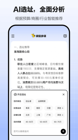 袋鼠参谋是一款专为餐饮行业设计的智能决策工具,由美团推出。软件利用先进的人工智能技术,结合丰富的行业数据,帮助餐饮商家在各个环节实现优化与提升。无论是赛道分析、开店选址,还是菜品研发及运营管理,袋鼠参谋都能提供科学的数据支持,帮助商家从传统经验向更为精准的决策转型,助力其在竞争激烈的市场中立于不败之地。