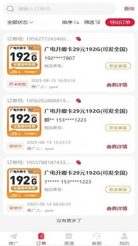 号推是一款专注于通讯服务产品推广管理的高效办公工具,帮助用户通过推广各种通讯服务产品赚取可观收益。免费领取号卡类产品进行推广,软件内置的搜索和筛选功能使得用户能够快速找到目标产品。号推还提供集中管理推广订单的功能,用户随时可以导出订单文件,方便查询订单信息和实时掌握审核进度。新手用户可通过内置的操作指南快速上手,还可以实时统计各项订单业务数据,帮助用户清晰了解业务详情,从而高效开展工作。