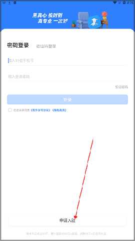 在本站下载并安装啄木鸟工程师APP后,首先需要申请入驻。点击界面上的申请入驻按钮,进入相关信息填写页面。