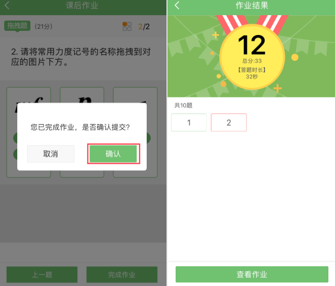 完成作业后,点击确认后可查看作业完成情况,帮助学生及时了解自己的学习进度。