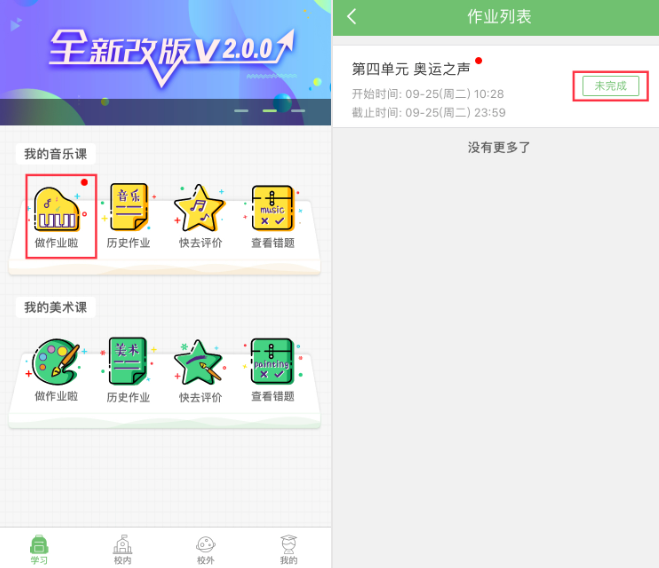 1.当教师端布置作业后,学生端会有推送消息,并有红点提示。点击学习界面上的“做作业啦”可以查看未完成的作业。
