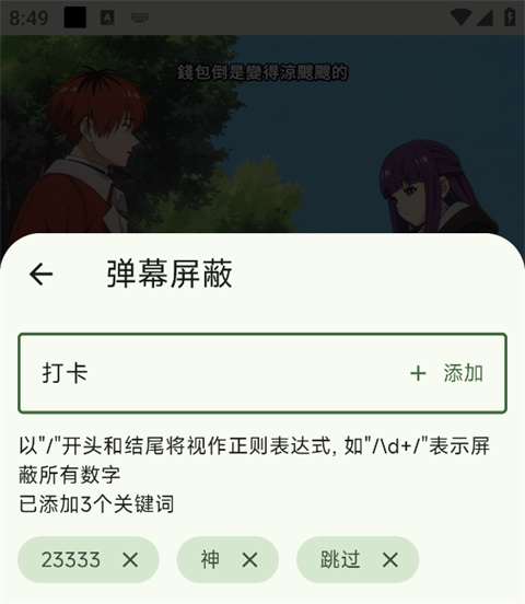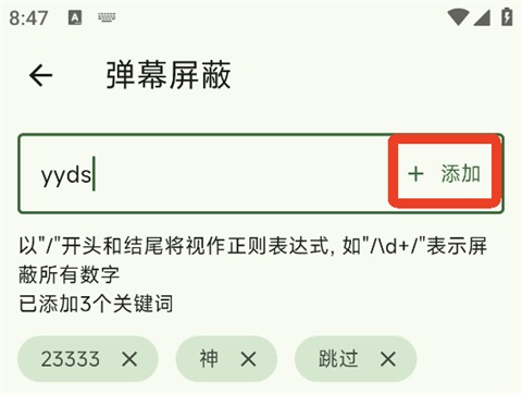 4、输入需要屏蔽的关键词或正则表达式,即可过滤对应弹幕。