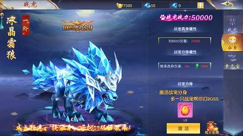 4、通过战宠培养、仙器激活提升战力,战宠是BOSS战的主要战力。