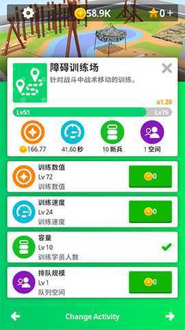 随着训练的深入,将获得资金,利用这些资金扩展营地,升级训练设施的各项属性,提升训练速度和士兵容量,逐步打造出强大的军事基地。
