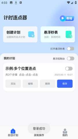点击创建计划,选择所需的操作类型,设置点击次数和频率等参数,点击完成即可。所有设置一目了然,便于操作。
