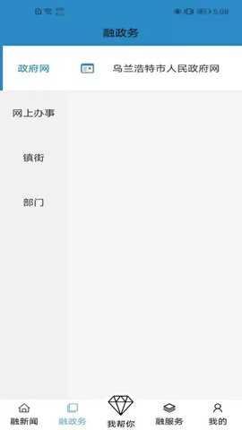 点击底部导航栏的融政务选项,浏览乌兰浩特市人民政府网的内容,包括各部门的入口、镇街的政务信息和线上办事服务,确保操作清晰可查。