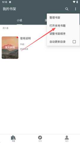 点击右上角的三点图标,弹出下拉菜单,选择打开本地书籍选项。