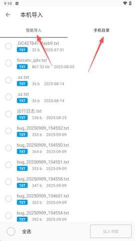 在本地导入界面,选择智能导入或手机目录导入,智能导入功能会自动识别TXT文件,选择好后即可将其加入书架。