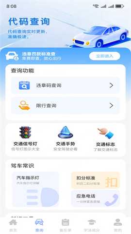 点击下方工具栏中的“查询”选项,可进入违章代码查询功能模块,能轻松了解各类违章的详细情况。