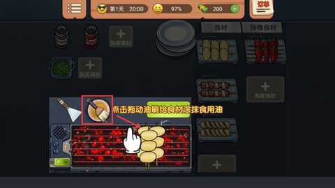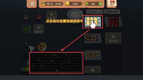 根据顾客的点单需求,点击对应的食材,将其放到烧烤架上,准备进入正式的制作流程,确保每道菜品都能满足顾客的期待。