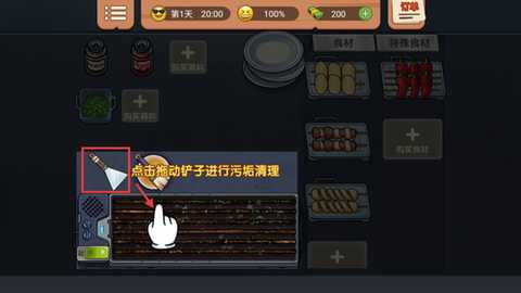 需要点击并拖动铲子,清理烧烤架上的污垢,确保烤架干净后,才能开始后续的烹饪操作,保证食物的卫生与口感。