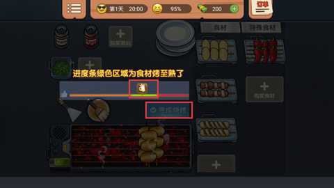 等待进度条进入绿色区域,表示食材已熟,需要点击完成烧烤,及时出餐招待顾客,提升顾客的满意度。