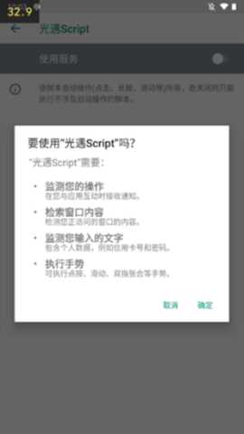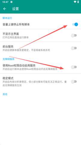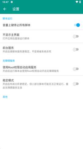 点击右上角的选项,进入设置界面,将看到脚本运行、无障碍服务等多项功能。