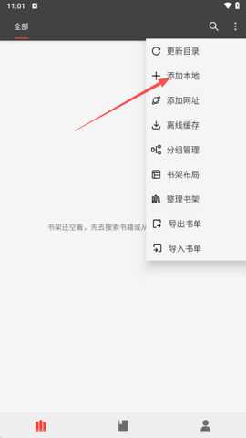 在下拉菜单中,选择添加本地书籍功能,选择系统文件夹或自带文件夹来导入小说。