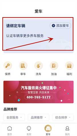 在爱车栏可以绑定自己的车辆,认证车辆可以享受更多的养车服务。