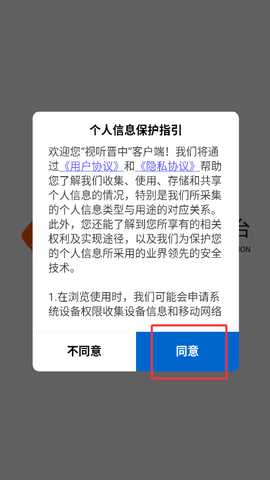 首次启动时,系统会显示用户协议弹窗。点击“同意”按钮后,将进入晋中本地服务平台的登录页面。