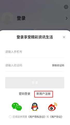 在登录页面底部,点击“新用户注册”,即可开始进行手机号验证流程。