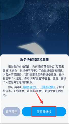 1、在应用中点击"同意并继续"服务协议,进入登录界面。