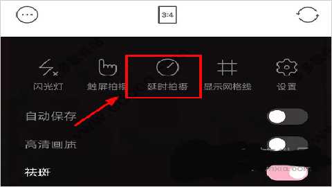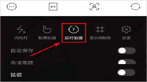1、在相机左上角的设置功能界面可以看到”延时拍摄“功能,点击一下即可。
