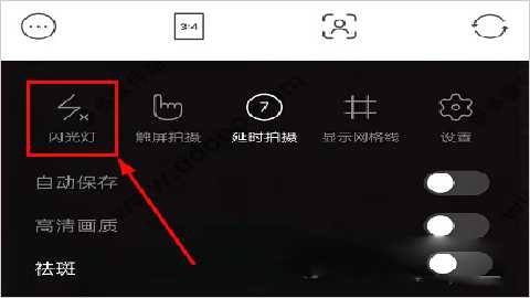 1、在相机左上角的设置功能可以看到”闪光灯“的功能选项,点击开启。