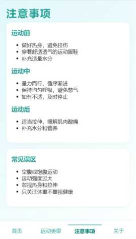 运动注意事项:详细涵盖运动前热身、运动中注意事项及运动后放松技巧,帮助用户减少受伤风险。