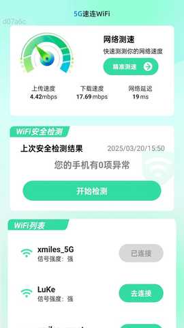 5G速连WiFiapp是一款功能强大的网络工具,提供安全、高效的上网体验。5G速连WiFi手机版主要功能包括记录用户连接的WiFi及密码,支持网络速度测试,并实时监控网络安全,确保网络环境不受侵害。通过工具快速检测网络速度,包括上传和下载速度,以及网络延迟等信息。