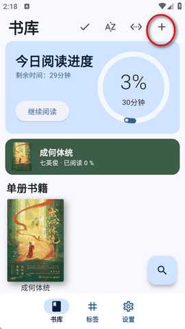 在本站下载Moeli阅读软件,安装完成后打开软件,进入书库页面,点击右上角的+号,选择需要添加的EPUB或MOBI格式电子书文件。