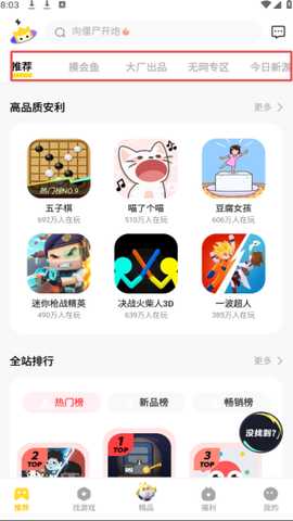 1、我们可以在首页上部的标签栏,切换标签,筛选相对应的优质游戏;