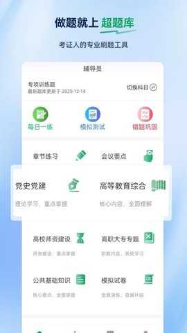 辅导员超题库是一款专为辅导员考试设计的高效刷题工具,为考生提供全面的备考支持。通过丰富的题库资源,考生能够轻松找到合适的练习题,满足各个科目的复习需求。软件提供了多种刷题模式,如章节练习和模拟测试,还能帮助考生巩固知识点,提升应试能力,确保考生在考试中游刃有余。