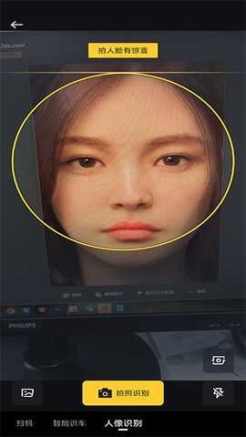 3、这时将人脸放进黄色的方框中,点击【圆点】拍照,等待几秒结果就出现啦。