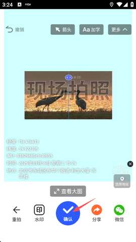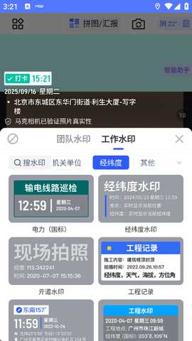 回到软件界面,点击屏幕下方的水印选项,选择所需的水印类型,进行编辑并设置相关信息,完成后点击保存,按下拍摄按钮,即可拍摄带有水印的照片。