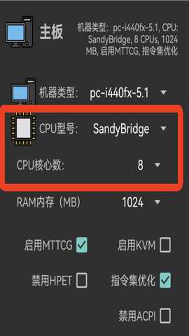 5、CPU型号选择【SandyBridge】,CPU核心数选择【8】。