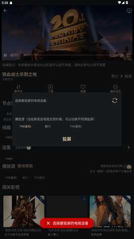 如果想要将视频投屏到电视,首先选择需要投屏的视频,进入播放界面后,点击右上角的【TV】按钮,在选项中选择【投屏】按钮,设备搜索完成后,直接点击自己的电视进行连接即可。