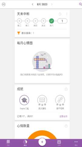 点击【统计】功能,可以查看每月的情绪趋势图、成就徽章及心情次数等数据,帮助用户更好地了解自己的情绪变化。