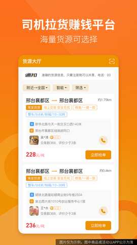货源信息展示:货源信息大厅展示多条线路与类型的货运需求,司机可选择符合自身车辆条件的订单。