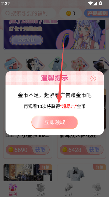 2、按照温馨提示页面的要求,点击跳转观看广告,获取兑换物品需要用到的金币。